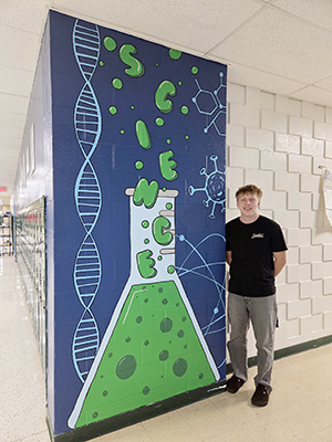 Zachary Williams stands next to a mural he created in the Science wing at Catoctin High School.