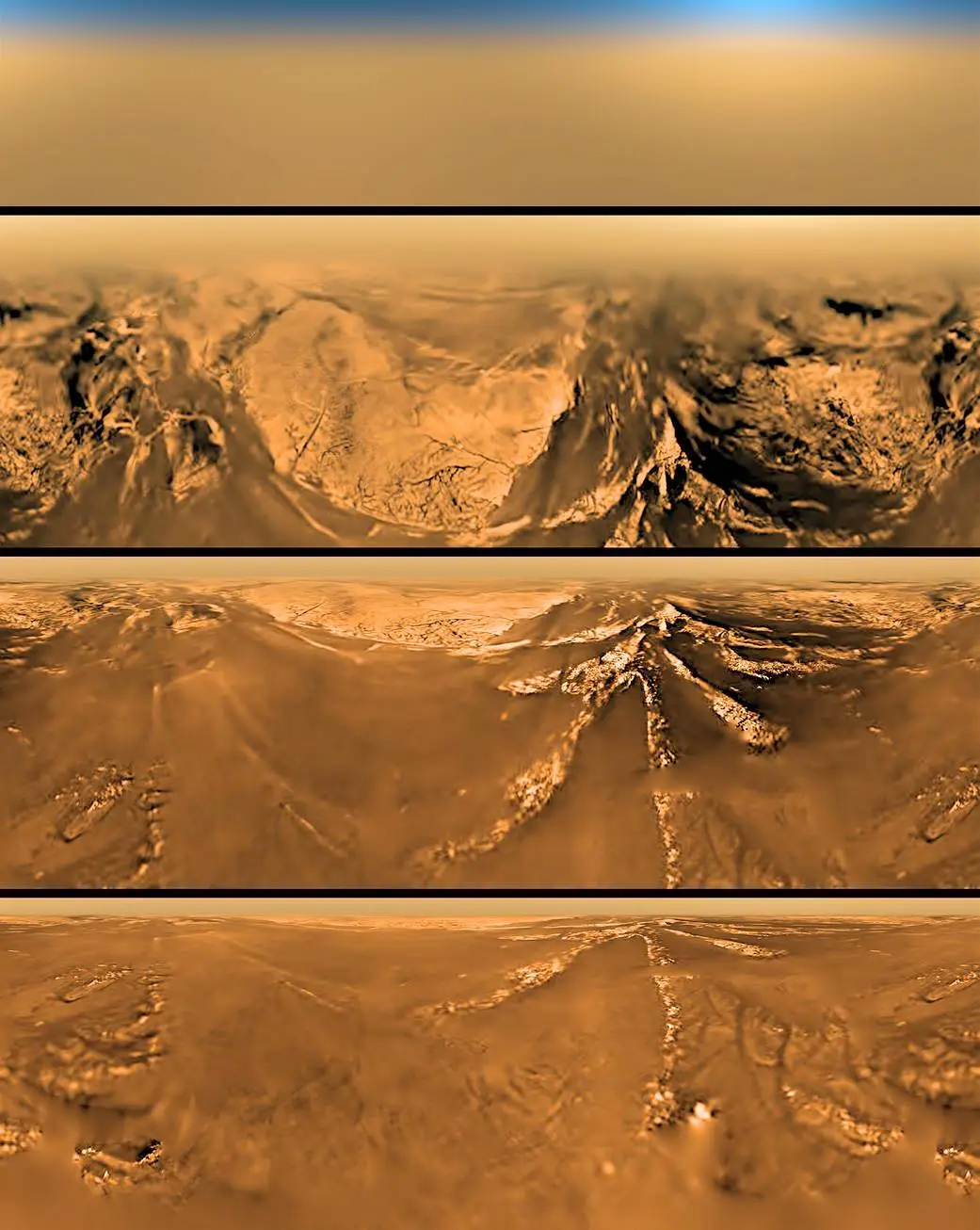 In 2005, the Huygens probe takes these images of Saturn’s moon, Titan, at four different altitudes as it descends to the surface. Source: nasa.gov