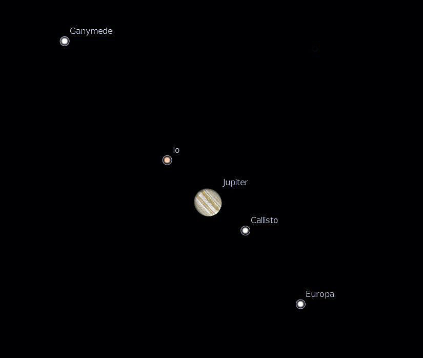 Jupiter and its Galilean moons (similar to what I see when looking through my telescope).