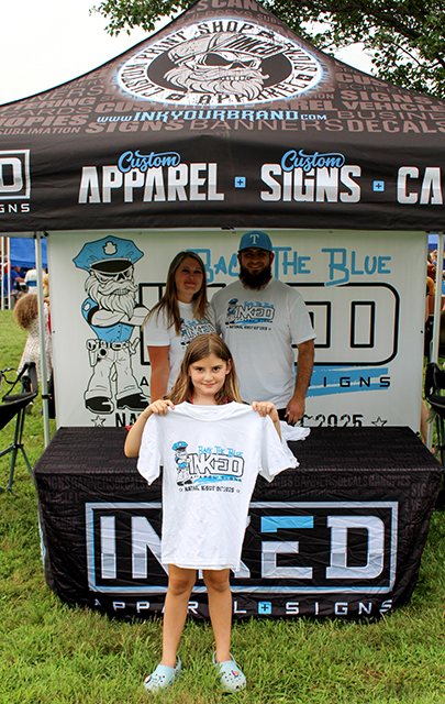 Kallie Hamilton poses with a free custom-designed shirt, being handed out at Thurmont’s National Night Out by owners of Inked, Kaitlyn and Rob Nash.