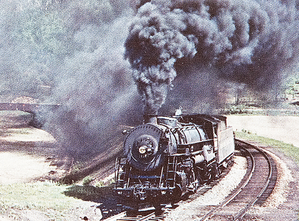 Western Maryland Railroad steam engine on the “big curve” at Corriganville, Maryland, 1952.