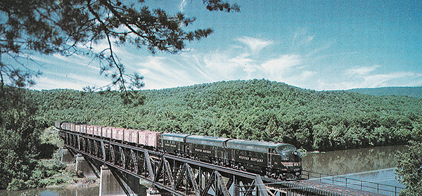 Western Maryland Railroad diesel crossing the Potomac near Little Orleans, Maryland.
